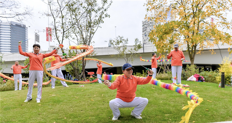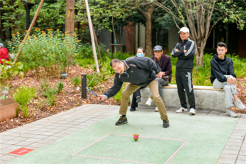 在活动现场,大家兴致勃勃地参与了饶有趣味的刮片子、顶核子、掼结子等弄堂游戏。读初一的宋怡倩参加掼结子,年级虽小表现不俗。扯铃子(空竹)高手袁老伯手把手教观赛小朋友怎么把铃子扯起来。这些上海弄堂里的经典游戏,对成长在那个年代的人来说,是值得珍藏的美好回忆。如今的九子大赛,让少年人找到乐趣,让成年人焕发青春,让老年人重拾童真。