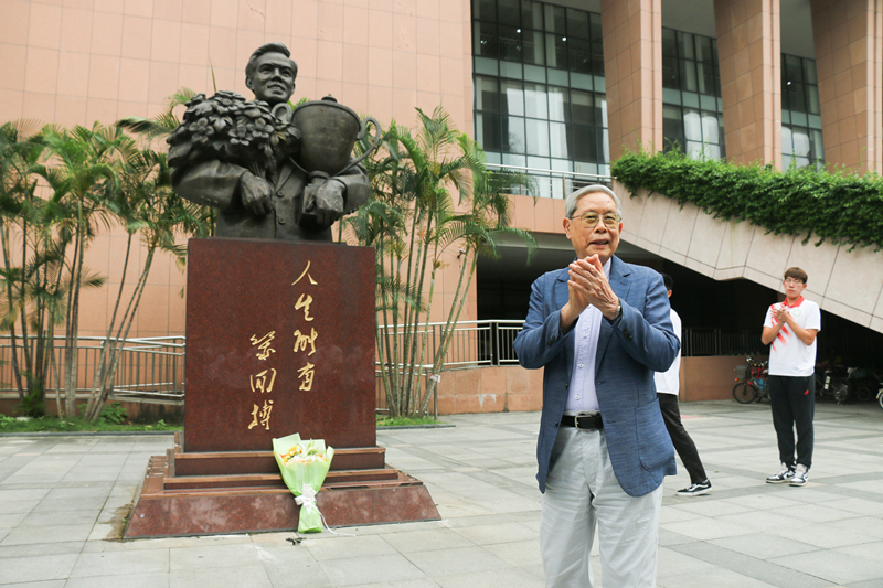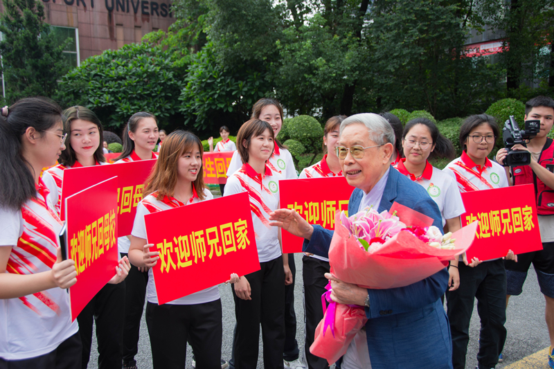 一位身着西装、满头银丝,手捧着鲜花的85岁老人,日前在200名学生代表的掌声中步入广州体育学院南大门。他是广州体育学院1957级体训班学生、新中国第一个游泳世界纪录创造者戚烈云。