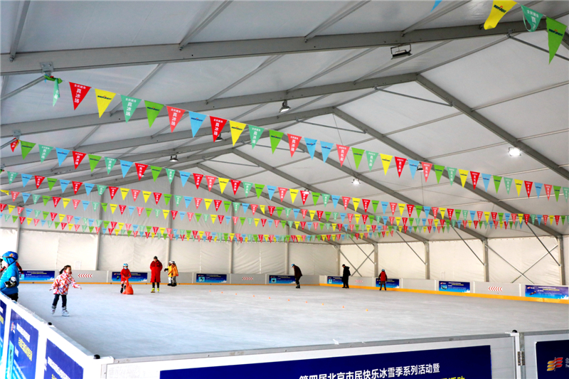 今年,澳瑞特特意为丰台区冰场提供价值70万的人字顶棚及价值30万元的钢制水平基架,有效防止风沙及太阳辐射,降低冰面融化速度,为滑冰者提供更好的环境和场地。