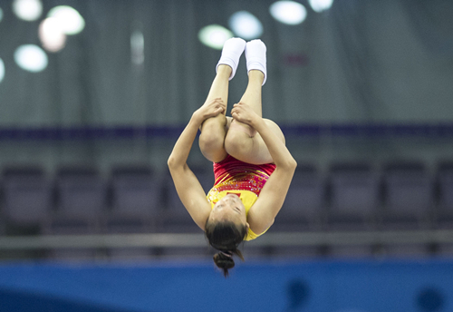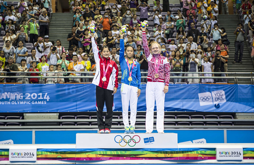 2014年8月21日,南京青奥会女子蹦床决赛在南京奥体中心体育馆进行,中国队朱雪莹以55.425的成绩摘得金牌。