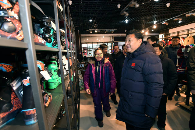 【习近平走进滑雪场考察,祝大家玩得开心!】张家口崇礼区云顶滑雪场,习近平走进一家滑雪用具店。他向店员细致询问了头盔、雪服、雪鞋、雪板等滑雪用具的品牌、价格、产地,了解其功能用途和销售情况。商店外的大厅,上百位游客和滑雪爱好者看到总书记来了,簇拥过来,争先恐后同总书记握手,向总书记拜年。习近平亲切问候大家:“新春快乐,祝你们在这里玩得开心!”