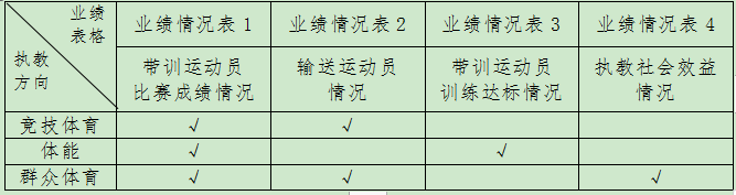 3.申报人在本人执教方向内,据实填报1个或多个业绩情况表。执教方向与业绩情况表填报关系见下表。
