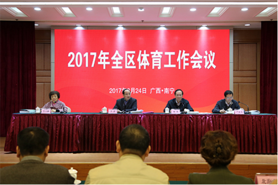 会议全面部署了2017年全区体育工作主要任务。全区体育系统将围绕“打好体育翻身仗、重振广西体育雄风”目标任务,通过采取一系列创新举措,深入实施“八大工程”。实施竞技体育重振雄风工程,全力备战天津全运会,优化项目布局,实施教练员“强将”工程和运动员“尖子”工程,完善竞技体育管理体制;实施群众体育星火燎原工程,完善科学健身服务体系,丰富全民健身活动供给,加快发展各类体育社会组织,促进全民健身与全民健康深度融合;实施健康广西体育惠民工程,加大体育设施建设力度,加大体育设施免费低收费开放力度,加强体育设施建设管理;实施体育赛事兴旺工程,鼓励和支持各级体育部门和各类主体举办体育赛事,举办和申办一批重大体育赛事;实施体育产业发展工程,加强体育产业政策执行及规划,扶持一批重大产业项目,做大做强体育产业;实施体育彩票跨越工程,大幅扩大网点布局,强化队伍建设,创新营销管理体制机制;实施青少年足球改革工程,推动各级足球协会改革,建立完善青少年足球训练体系,活跃足球赛事;实施基层体校强基工程,深入实施“双百”计划,加强对基层体校的管理和支持,加大基层体校教练员培养力度。