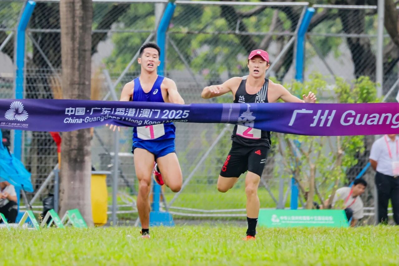 冲线瞬间,陈柏良前腿过线,李刘畅胸部撞线带着飘带缓冲欢呼,而陈柏良冲线后踩到水坑摔倒了。电子计时显示,陈柏良领先0.01秒率先触线!