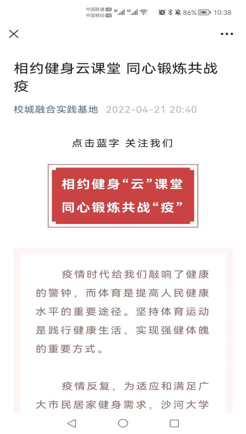 北京市海淀区文明志愿者协会与校城融合实践基地建设相结合,以昌平区沙河镇恒大幸福家园第一社区为中心,发动青年志愿者,克服疫情困扰,通过线上或线下方式,先后组织了“相约健身云课堂 同心锻炼共战疫”“运动打卡一起来 宅家健身不停步”“全民健身“益”起来——蹦床体验活动”等居家健身和户外健身活动。