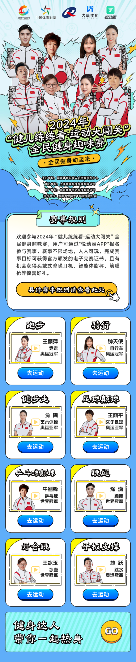 作为连续多年举办的热门线上赛事,今年的赛事全新升级,亮点纷呈。“趣味赛”精心设置了“健儿练练看”和“趣味闯关赛”两个精彩环节。7月8日至8月7日,“悦动圈”APP线上的“健儿练练看”环节率先登场,竞走奥运冠军王丽萍、自行车奥运冠军钟天使、艺术体操奥运亚军侴陶、女子足球奥运亚军王丽平、乒乓球世界冠军牛剑锋、蹦床世界冠军涂潇、冰壶世界冠军王冰玉、跳水奥运冠军林悦等八位顶尖运动健儿将亲自引领,指导大众进行跑步、骑行、健走、足球颠球、乒乓球颠球、跳绳、开合跳、平板支撑八个项目的锻炼。这些训练项目简单易行,旨在鼓励广大民众积极参与,无论您是运动新手还是健身达人,都能轻松上手。希望通过前期的引领示范训练,参与者能够更好地掌握运动技巧,提升项目熟练度,为8月8日至28日举行的“趣味闯关赛”打下坚实基础,在比赛中一展身手,勇夺佳绩。