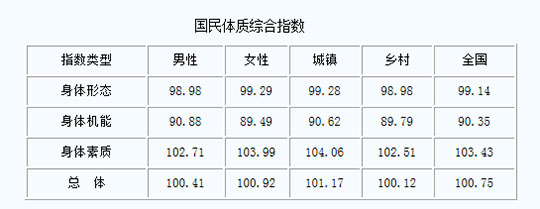 国民体质综合指数为100.75,比2000年提高了0.75%。国民身体形态综合指数为99.14,比2000年降低了0.86%;国民身体机能综合指数为90.35,比2000年降低了9.65%;国民身体素质综合指数为103.43,比2000年提高了3.43%。
