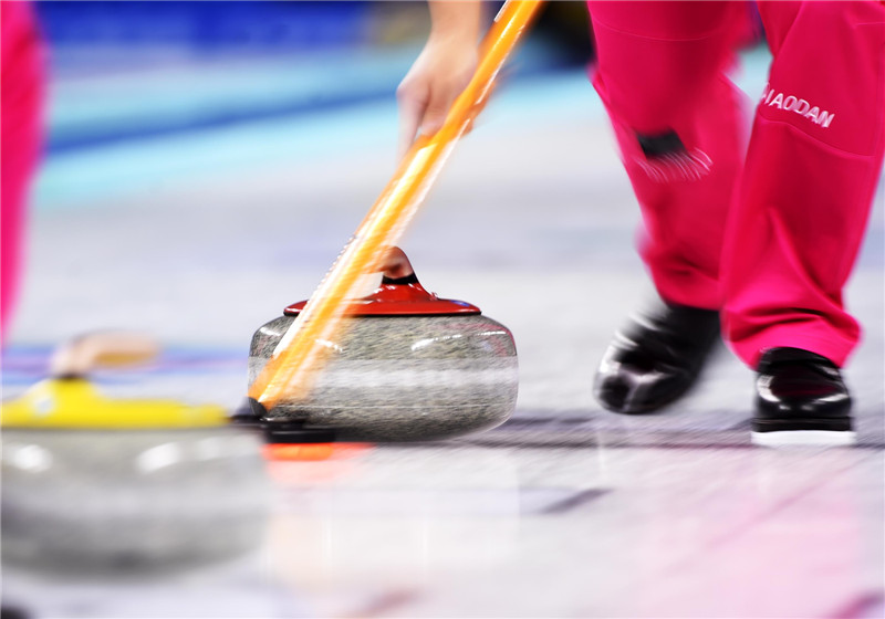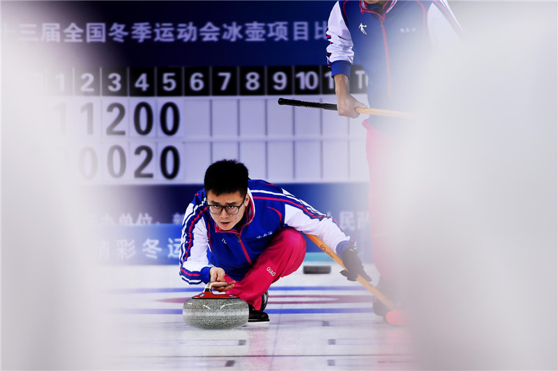 2016年1月27日,第13届全国冬运会男子冰壶第六轮,在新疆冰上运动中心冰壶馆举行。哈尔滨队(蓝衣)以6比3战胜佳木斯队。