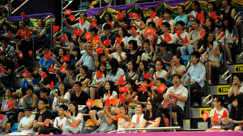 观众挥动中国国旗和香港特区区旗为运动员加油 卢炳辉摄
