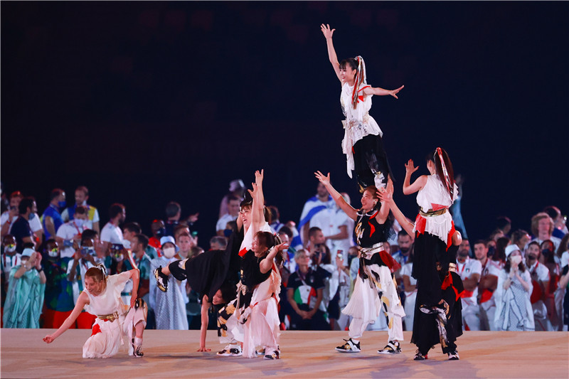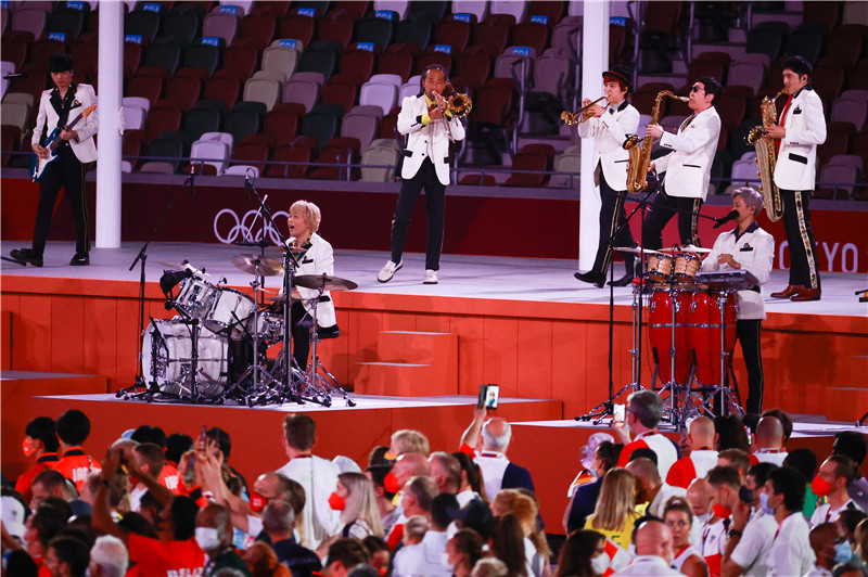 在奥运五环旗引领下,206个代表团运动员代表依次入场。在东京以9秒83创造男子百米亚洲纪录的苏炳添作为中国代表团旗手,高举五星红旗出场。