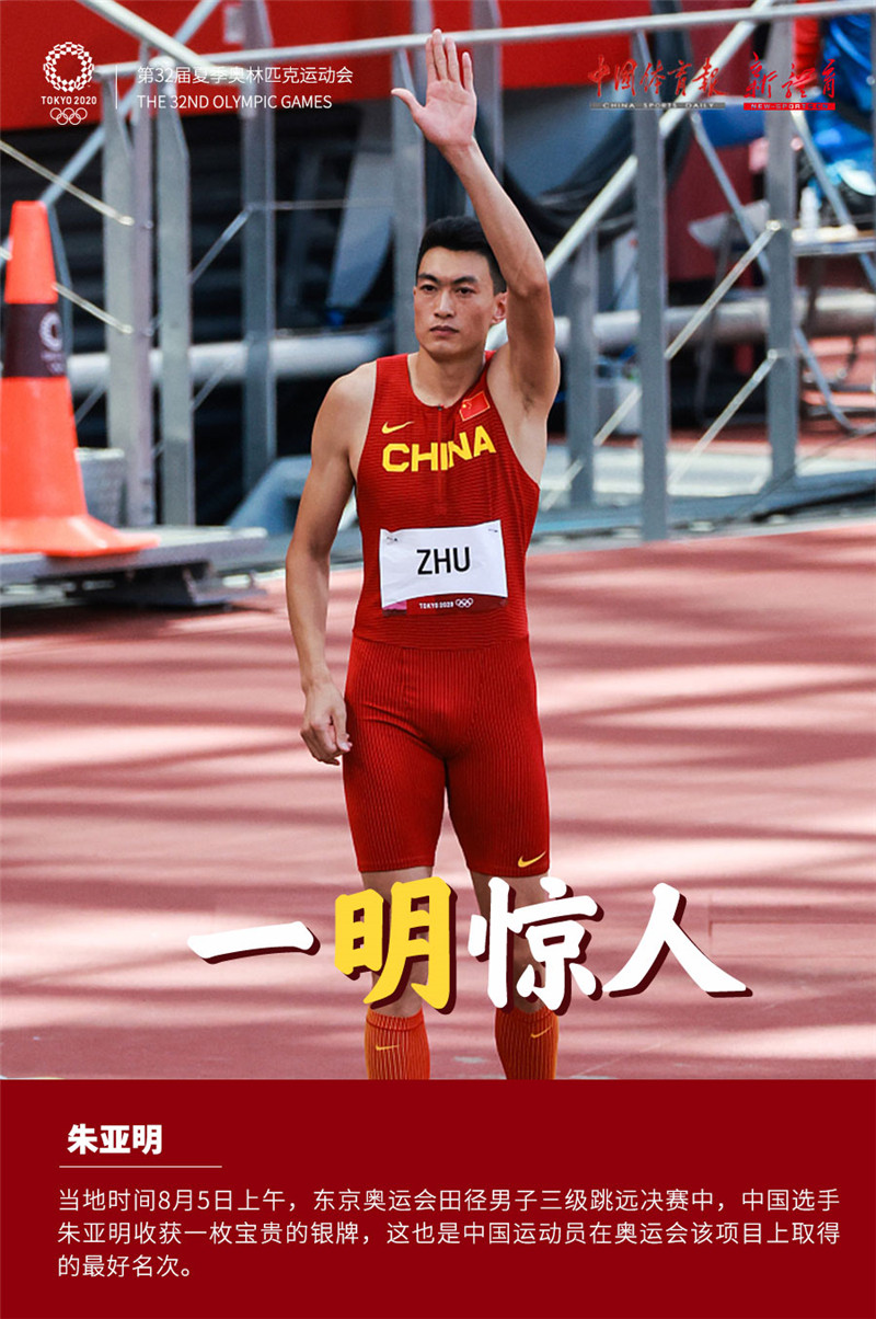 8月5日上午,在东京奥运会男子三级跳远决赛中,中国选手朱亚明两度刷新个人最好成绩,以17米57的成绩获得一枚宝贵的银牌,这也是中国运动员在奥运会该项目上取得的最好名次。另一名中国选手方耀庆以17米01的成绩获得第8名。 ????