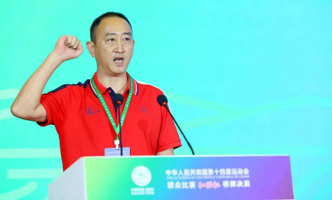 在运动员、裁判员宣誓环节,浙江队员尤坚勇、副裁判长王爱军分别代表运动员和裁判员上台宣誓。