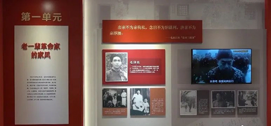展览现场以红底黄字展示了毛泽东的“家风三原则”——“恋亲不为亲徇私,念旧不为旧谋利,济亲不为亲撑腰”。