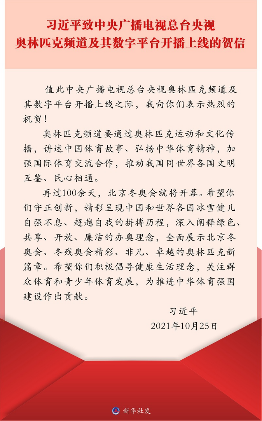 习近平致信祝贺中央广播电视总台央视奥林匹克频道及其数字平台开播上线强调