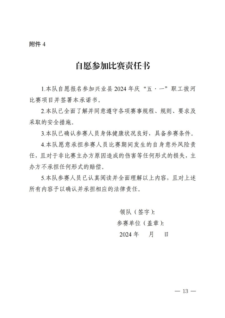 中共兴业县委办公室兴业县人民政府办公室关于印发《兴业县2024年庆“五·一”职工拔河比赛工作方案》的通知