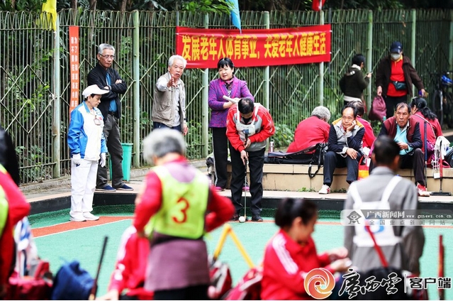 门球运动一直是广西一项重要的全民健身项目。图为在南宁市白沙大桥门球场,老人们在进行门球比赛。(资料图)记者 金翔义 摄
