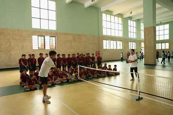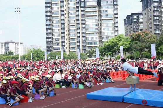 当天在五象小学进行的是启动仪式和首站活动。在广西体操武术运动发展中心的鼎力支持下,广西体操队的教练和队员们来到了现场助阵,并受到同学们的热烈欢迎——在前不久的全运会体操项目的青年组比赛中,广西队拿到了团体银牌,创造历史最好成绩。当领队陆启周带着主力队员郑宝森、荣子皓、张恩瑞登场时,操场上的数百名小学生送上了欢呼和掌声。