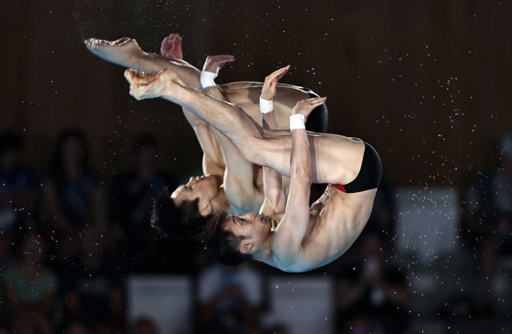 第四跳是让人几乎不能呼吸的一跳,戴利/威廉姆斯的207B直接跳出了93.96的高分,这给紧跟在他们后面出场的杨昊/练俊杰带来了巨大的心理压力。前面戴利和威廉姆斯精彩一跳引起的欢呼声迟迟未落,杨昊/练俊杰不慌不忙,稳稳走上跳台,蓄力、起跳、翻腾、入水,两人“复制粘贴”,一气呵成,这一跳307C拿下了95.88的高分。