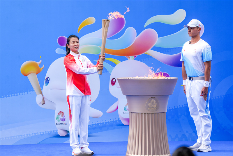 在全场注目下,采自南海深处“燃冰成炬”的十五运会圣火迎入启动仪式现场。第一棒火炬手——中国科学院院士、国家最高科学技术奖获得者、南方科技大学校长薛其坤高举火炬起跑。随后,香港、澳门、广州分别举行起跑仪式,四地共设火炬手200棒,同步点燃激情。
