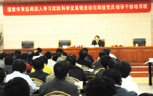 10月14至15日,国家体育总局举办深入学习实践科学发展观司局级党员领导干部培训班。学习培训主要围绕司局级党员领导干部作表率,深刻领会学习实践活动的重大意义,深入理解科学发展观的科学内涵、精神实质和基本要求,准确理解和把握学习实践活动的指导思想、主要原则、目标任务和实施步骤,理清开展学习实践活动的基本思路等内容进行。与会同志共同学习,共同探讨,相互交流,相互启发,使学习培训达到了预期目的。