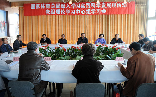 按照体育总局党组学习实践科学发展观活动第一阶段的工作安排,总局党组理论学习中心组于11月5日集中一天时间,讨论、交流学习体会。中心组是在认真学习规定书目和四个专题学习后,组织的这次学习会。党组书记、局长刘鹏主持中心组学习会。总局党组副书记、副局长胡家燕,党组成员、副局长于再清、段世杰、冯建中、肖天、崔大林、蔡振华参加了学习讨论并先后发言,各厅司局长参加了学习会。