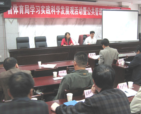 省体育局深入学习实践科学发展观活动领导小组组长、局长、党组书记李建明同志参加讲座并作学习动员,副局长林晓华同志主持了此次专题学习活动。