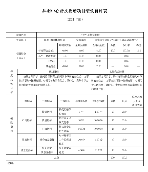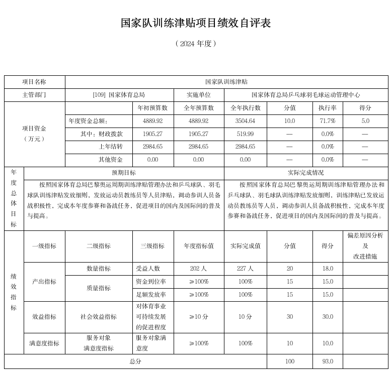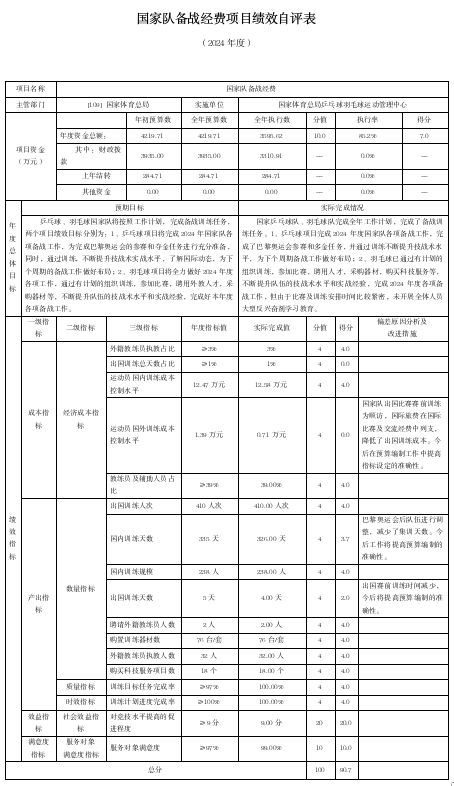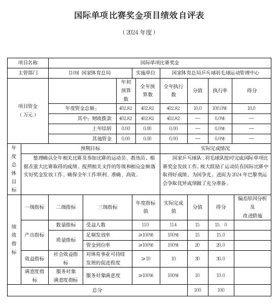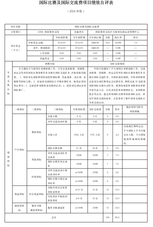 2024年,乒乓球、羽毛球两个项目完成了优秀运动队竞赛、国家队备战、国际比赛及交流、青少年体育推广与提升、全民健身等各项工作任务,并对照工作实际开展情况与年初设定的绩效目标绩效指标,完成绩效自评工作。