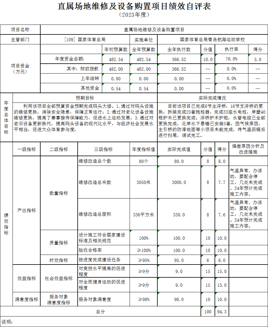 根据预算绩效管理要求,2023年度青岛航校规范有序开展绩效自评工作,其中:一般公共财政预算自评包括4个项目,预算资金1,308.45万元,分别是:非奥项目集训、竞赛及器材经费项目、青岛航校武昌路1号运动员公寓改造项目、直属场馆及附属设施运行经费项目、直属场地维修及设备购置项目。自评覆盖率100%。