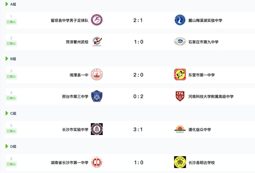 首个比赛日的小组赛,除邢台市第一中学、秦皇岛市第一中学轮空外,其余12支队伍悉数亮相。A组,留坝县中学2:1力克麓山梅溪湖实验中学,菏泽曹州武校凭借上半场的进球1:0战胜石家庄市第九中学。B组,湘潭县一中、河南科技大学附属高级中学分别以2:0的比分击败东营市第一中学和邢台市第三中学。C组奉献一场精彩的对攻大战,在半场互交白卷的情况下,下半场长沙市实验中学连入三球,以3:1战胜遵化益众中学。D组“长沙德比”精彩纷呈,最终凭借着全场比赛补时阶段的进球,长沙市第一中学1:0“绝杀”长沙县明达学校,涉险过关。