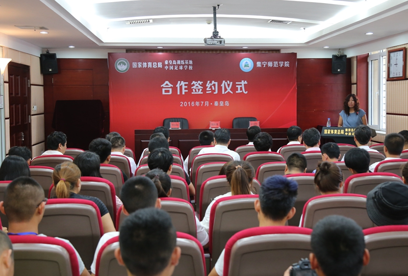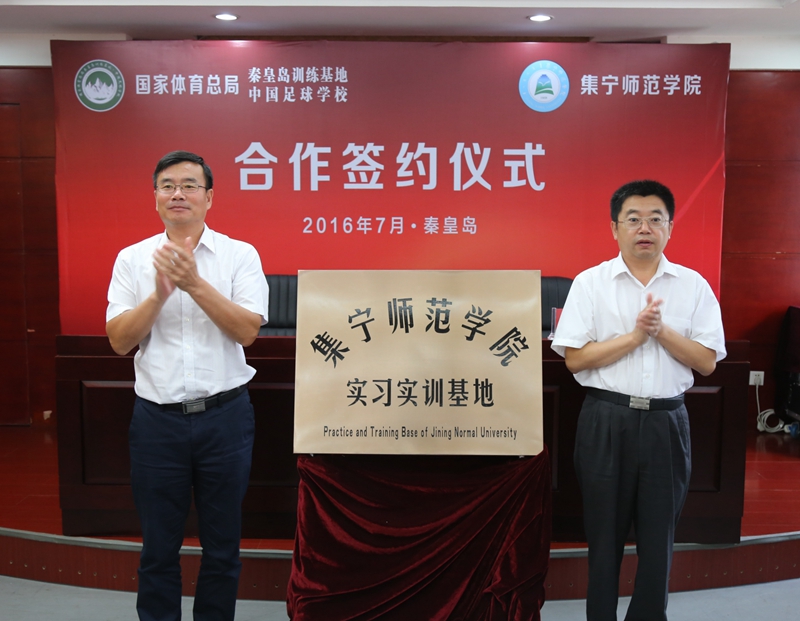 7月16日上午,秦皇岛基地(中国足校)与集宁师范学院在秦皇岛举行合作签约、揭牌仪式。 秦皇岛基地(中国足校)主任(校长)丁启鹏和集宁师范学院党委书记刘前贵共同为“集宁师范学院实习实训基地”揭牌,秦皇岛基地(中国足校)副主任(副校长)崔军和集宁师范学院党委委员、副院长许卫签署合作协议书。双方将在今后的教学培训、实习、驻训等方面开展深入合作与交流。双方相关领导、基地(足校)职工代表和集宁师范学院实习师生参加签约及揭牌仪式。仪式结束后,刘前贵书记一行在基地(足校)领导的陪同下参观了院区场地及场馆设施设备,并看望了实习师生。 集宁师范学院第一批27名实习师生已于14日到达基地,开展为期40余天的实习生活。目前,他们已投入中国足球学校2016年第四届河北华夏幸福杯全国足球训练营的赛事组织、赛场保障及队伍管理等工作,后续还将陆续参与到全国篮球高水平后备人才基地U15训练营、“宋庆龄杯”中国-东盟青少年足球友谊赛和全国青少年校园足球夏令营总营等活动中。
