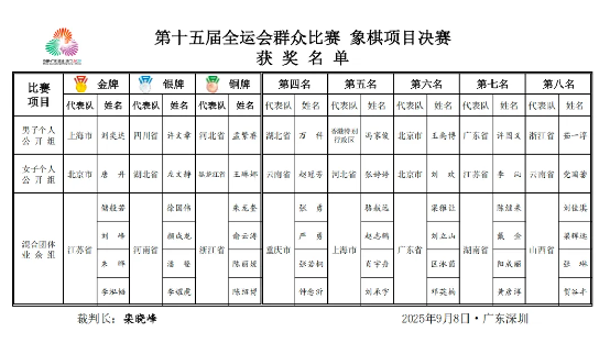 9月8日,中华人民共和国第十五届运动会群众比赛象棋项目决赛在广东省深圳市罗湖区进行了第四个比赛日的争夺,三个项目冠军出炉。在上午进行的争夺中,男子个人公开组决赛上海刘奕达和四川许文章在慢棋弈和,加赛快棋再次弈和,刘奕达在第二盘超快棋加赛中战胜对手,获得冠军,许文章获得亚军;铜牌赛河北孟繁睿慢棋后手战胜湖北万科,获得铜牌。