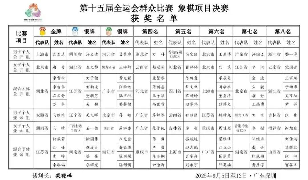 9月12日,第十五届全运会群众比赛象棋项目决赛在广东省深圳市罗湖区落下帷幕,赛事共设6个项目,共有来自全国23个省(自治区、直辖市),香港、澳门特别行政区及1个行业体协的26支代表队,134名运动员同台竞技。