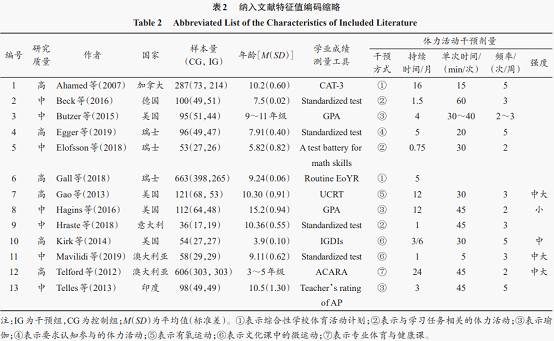 采用Excel对纳入的13项研究进行编码,提取以下特征值:作者、年份、国籍、样本特征(样本量和年龄)、学业成绩测评工具、体力活动干预剂量(干预方式、持续时间、单次时间、频率和强度)、研究结果(表2)。
