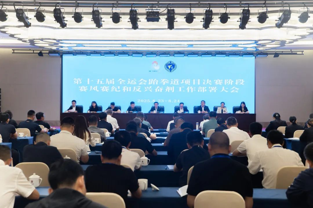 2025年8月23日上午,第十五届全国运动会跆拳道项目决赛阶段赛风赛纪和反兴奋剂工作部署大会在河北石家庄举行。体育总局拳跆中心党委书记、主任、中国跆拳道协会主席张智,中国跆拳道协会副主席(驻会)刘晓辉,体育总局拳跆中心纪委书记、副主任、中国跆拳道协会秘书长李春刚出席会议,李春刚担任主持人。拳跆中心、中国跆协相关部门工作人员,各参赛队主要负责人及领队,十五运跆拳道决赛阶段裁判员参加会议。