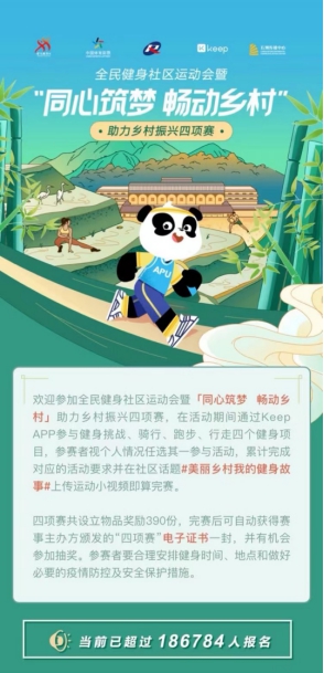 金秋九月,全民健身社区运动会暨“同心筑梦 畅动乡村”助力乡村振兴四项赛(以下简称“四项赛”)正在如火如荼进行中。赛事以“云赛事”模式展开,自8月8日正式启动以来,已有超过18万用户通过互联网运动平台Keep APP报名并开展线上健身运动。