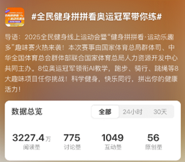 为提升赛事专业性与号召力,趣味赛特别邀请八位体育界优秀运动员担任项目示范嘉宾,阵容涵盖多个运动项目:竞走奥运冠军王丽萍、自行车奥运冠军钟天使、柔道奥运冠军杨秀丽、女子足球奥运亚军王丽平、乒乓球世界冠军牛剑锋、花样游泳世界冠军陈晓君、跳水奥运冠军王鑫、艺术体操世界杯分站赛亚军朱丹。八位嘉宾通过录制示范视频、分享独家运动经验与训练技巧,为参赛者提供指导,同时以自身运动精神激励大众积极参与健身,发挥了极佳的榜样引领作用。赛事期间,参赛者们还通过微博话题“#全民健身拼拼看 奥运冠军带你练#”,主动分享运动成果、训练心得与趣味瞬间,形成积极向上的运动社交圈,让全民健身理念借助社交平台实现更广泛传播,话题阅读量达3227万次。