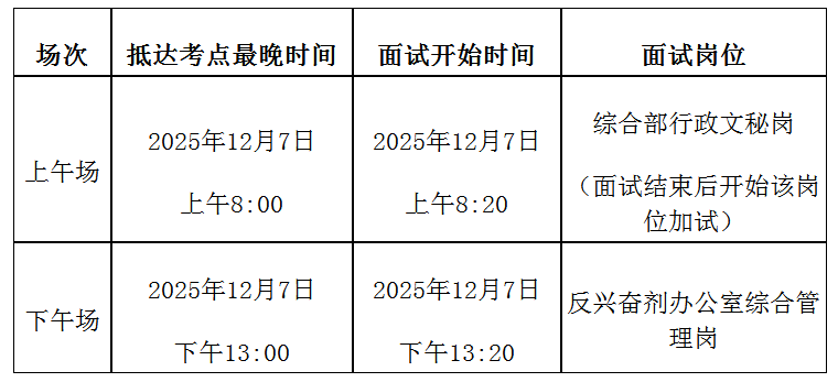 面试时间为2025年12月7日全天,分为上下午两场,参加上午面试的请于8:00前抵达候考地点;参加下午面试的请于13:00前抵达候考地点。未按时抵达的视为自动放弃面试资格。
