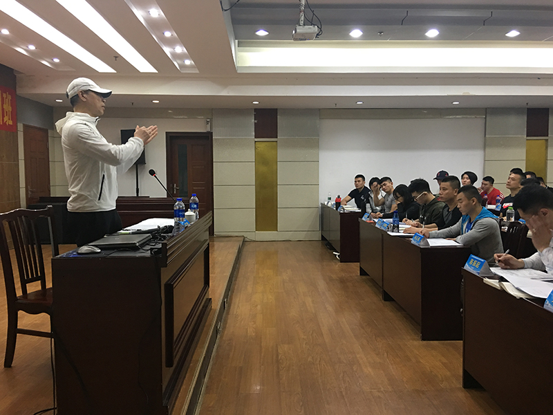 学员老师合影 几天来,学员学习热情高涨,积极主动,在课堂上模拟教学的场景进行模拟授课,相互点评,相互指导和学习。培训班还进行了体能测试、理论测试以及授课考核。