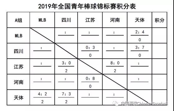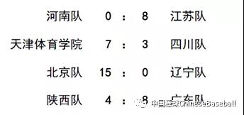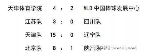 4月10日比赛成绩  在天津体育学院和MLB中国棒球发展中心的比赛中,MLB队的五棒朱天舟在第二局抓住三振逃的机会站上一垒,六棒击出三垒方向的地滚球,三垒手传球失误,MLB跑下一分。第六局,天津体育学院的跑垒员趁二垒手的失误跑下一分,将比赛拉到延长局。延长局中,天津体育学院的两支外野安打打下3分,天体的保局投手K掉两人,最终天体4:2战胜去年青年锦标赛的冠军队。在江苏队和四川队的比赛中,四川队一垒手首局就在二三垒有人的情况下失接三垒手传球,被江苏队跑下两分。随后江苏队李旗选球上垒后,被队友的牺牲触击和牺牲高飞送回,四川队虽然上垒人次比江苏队多,但江苏队3次双杀化解危机,最后江苏队3:0战胜四川队。