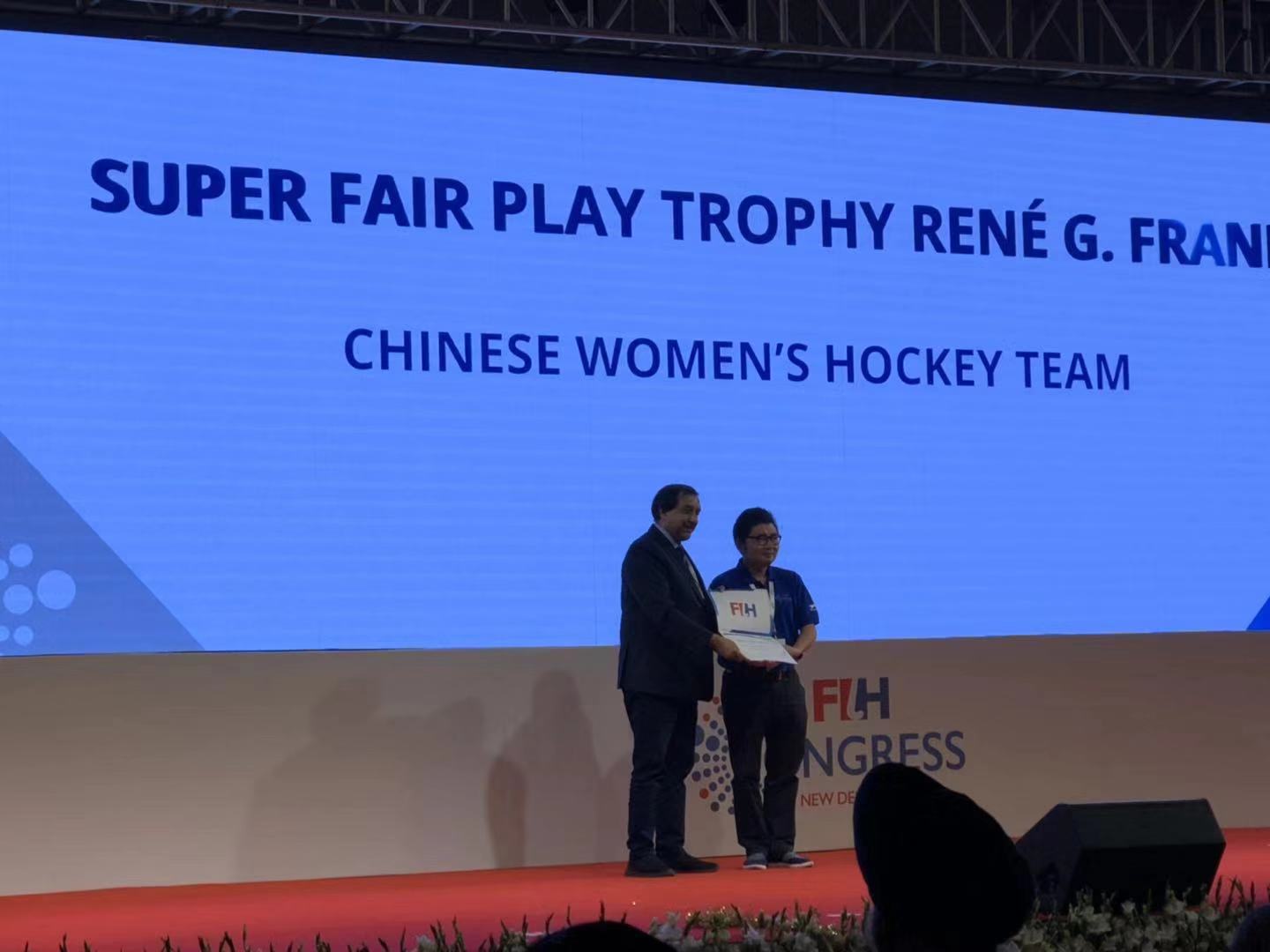 11月1日晚,在印度德里举行的国际曲棍球联合会代表大会期间,国际曲联授予中国女子曲棍球队杰出体育道德风尚奖,表彰女曲队在近年来国际大赛中对公平竞赛和顽强拼搏精神的示范性坚守和传扬。该奖项两年一度,是由国际曲联理事会综合考量世界优秀男女运动队伍后选出的一支具有代表意义的队伍予以颁发,也是此次大会众多奖项中唯一授予运动队的最高荣誉。能够获得国际曲联授奖,在中国曲棍球协会历史上还是第一次。