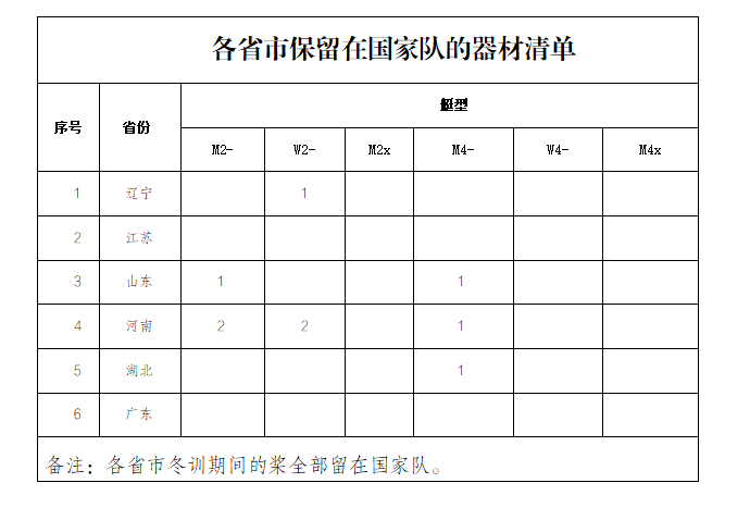 集训运动员的训练用艇、桨、桨频表、心率表以及训练服装等,由所属单位自行准备。根据训练计划,双桨组运动员需携带单人艇及一副双桨。各省市留在国家队的艇、桨器材清单附后。