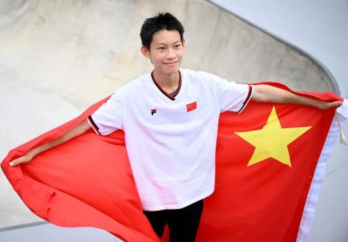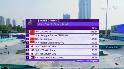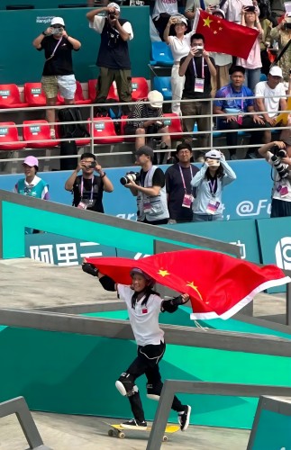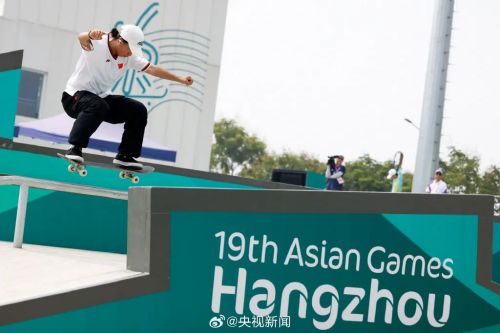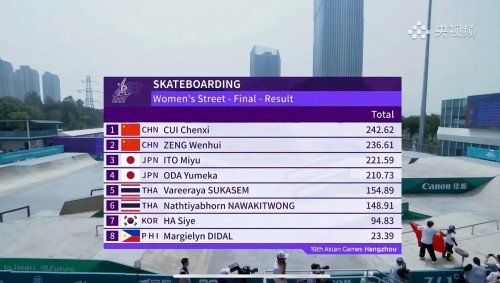 滑板女子街式决赛,年仅13岁的中国姑娘崔宸曦夺得金牌,成中国最年轻的亚运冠军,另一位中国选手曾文蕙摘银。