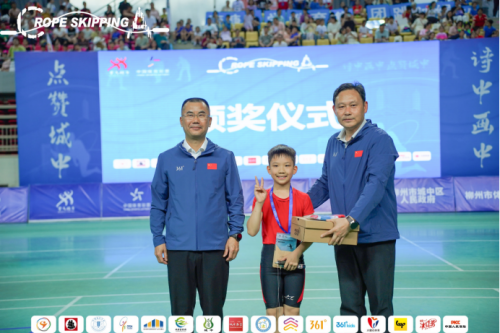 广东省广州市黄埔区东荟花园小学包揽4项全场总冠军,其中包亦正30秒单摇跳(双脚轮换跳)211次,周子赫3分钟单摇跳1050次,包亦正、王星州2×30秒双摇接力190次,周子赫、黄子谦、杨果蓁、崔雨诚4×30秒单摇接力762次;广州市交通运输职业学校孔荧莹、张崇霞、邱永毅以30秒交互绳速度210次斩获全场总冠军;广西壮族自治区宾阳县古辣镇中心学校跳绳队以481次喜获3分钟10人长绳“8”字跳全场总冠军;广西玉林光速跳绳东风传承蒋毅霖以341次夺得1分钟单摇跳(并脚跳)全场总冠军;广西南宁市秀厢东段小学一队则以190次荣获1分钟10人长绳集体跳全场总冠军,为观众带来一场精彩绝伦的速度盛宴,领导嘉宾为获奖选手颁发奖杯与361°运动装备。