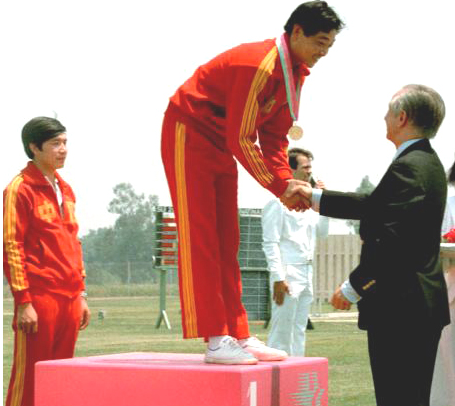 洛杉矶普拉多奥林匹克射击场,距离奥运村 87 公里,车程 1 小时 20 分钟。就是在这里,许海峰创造了历史。 1984 年 7 月 29 日,是洛杉矶奥运会首个比赛日,许海峰一大早就起来了,赶着最早的班车来到赛场。一到场地,他就取出枪和子弹,仔细擦拭着——这些子弹还是近十年前从英国购买的,弹头已经氧化,有些甚至长出了白毛。 上午 9 点,男子自选手枪慢射的比赛正式打响。一字排开的 80 个靶位上,许海峰排在 40 号。虽然现场来自世界各地的新闻媒体并没有过多关注许海峰,但他自己心里清楚,这里是他的福地。4月的奥运会测试赛,以及赛前两天的奥运会裁判实习赛,他都在这里打到了第一名。 50 米外,直径 5 厘米的圆心区域,是许海峰和众多对手追逐的精度所在,也就是手枪慢射的 10 环区域!按照当年的规则,男子手枪慢射比赛时间为两个半小时,选手们可试射 15 发,正式记分射 60 发。 试射打了 9 发后,许海峰开始正式换记分射了。每次比赛试射他都会留有余地,一旦比赛过程中发挥不够理想,他会换回试射靶再找找感觉。 第一组 97 环!第二组97环!这难得的好成绩让人吃惊。第三组,许海峰在打到第八发时出现了一个 8 环。随后,他放下枪,走到赛场外休息了半小时,这也是被美国记者报道当中表述的“许海峰在比赛中途失踪了半小时”,并不是失踪,只是放松自己、调整一下。 “坐在空地上看着蚂蚁,放空自己,全身放松,什么都不想。”许海峰解释说。这是他每每选择放松的最佳方法。 回来继续比赛,第三组 93 环,第四组 93 环,第五组 95 环。 这五组打完,许海峰心里知道,只要第六组不出现失误,冠军基本上就是他的了!但由于他打枪比较慢,此前又“失踪”了半小时,等到他开始第六组射击的时候,其余 55 名选手都已经打完离开,全场就只剩下他一个人了! 全场观众与新闻媒体屏住呼吸,射击场安静得令人窒息,只有个把照相机的闪光灯偶尔会不合规矩地闪起来……许海峰精力有点分散,“傻子都知道,我肯定打得好,不然大家不会都在等我的成绩……”这么想着,许海峰心里知道,自己精力有些分散了,这是射击项目运动员最不应该在赛场上出现的情况。 在全场观众的关注中,许海峰开始了最后一组的射击。10 环、9 环、9 环、8 环……前 7发打完,他感觉不好 :只有一个 10 环,却有两个 8 环! 不行,再打下去,就完了。 许海峰将枪放下,席地而坐,又休息了十来分钟。4月在同一场地举行的奥运会测试赛上,他也是在最后 3 发射击之前,放松休息了 10 分钟,那一次他拿了第一。他希望历史重演。 时钟滴滴答答地走着,牵动着观众的神经,也揪动着许海峰的内心。在距离比赛结束还有21分钟时,他站起身来,举起手枪。 没装子弹,空枪预习了4发后,许海峰进入了人境合一的忘我境界,装上子弹,他果断地扣动扳机!打出了最后3 枪——10环!10环!9环! 最后这一组,许海峰打出 91 环。结束比赛的时候,墙上的钟表显示,距离比赛结束,还有 14 分钟。 时间凝固了片刻之后,中国代表团开始欢呼,庆祝这一难得的胜利。按照现场裁判用望远镜观测结果报出的“毛”成绩,许海峰的环数高达 569 环!高出第二名 5 环。 大家的欢呼雀跃并没有带动许海峰,他自己心里清楚,他的成绩应该在566~567 环。按照规则,结束比赛后靶纸要送到成绩统计裁判组计算成绩,之后公布成绩,并且有 30 分钟的申诉期,一切都还未成定局。 所以,在周边一片欢腾之际,许海峰内心并不舒服。一是成绩或许还会出现变数,二是他对于最后一组的成绩实在不满意。 默默回到休息室,许海峰叮嘱团部工作人员随时去查看成绩。一会儿消息传来 :成绩公布栏上,许海峰 566 环,第二名 564 环,第三名 564 环。申诉的30分钟漫长而煎熬,当时间终于凝固之后,最终的成绩也再度发生变化 :许海峰依然是 566 环,第二名的成绩申诉回来 1 分,变为 565 环。直到组委会来人通知许海峰,要他以第一名的身份去领奖时,他才终于踏实下来。 随后便上演了一幕家喻户晓的“直升机送国旗”插曲。许海峰与王义夫分别摘得金牌和铜牌后,让组委会犯难了——他们没有想到中国代表团在这个项目上能够出现两人同时拿到奖牌的情况,只是例行性地准备了一面五星红旗。最终,组委会临时调度直升机送来一面五星红旗,才使得颁奖典礼得以顺利进行!