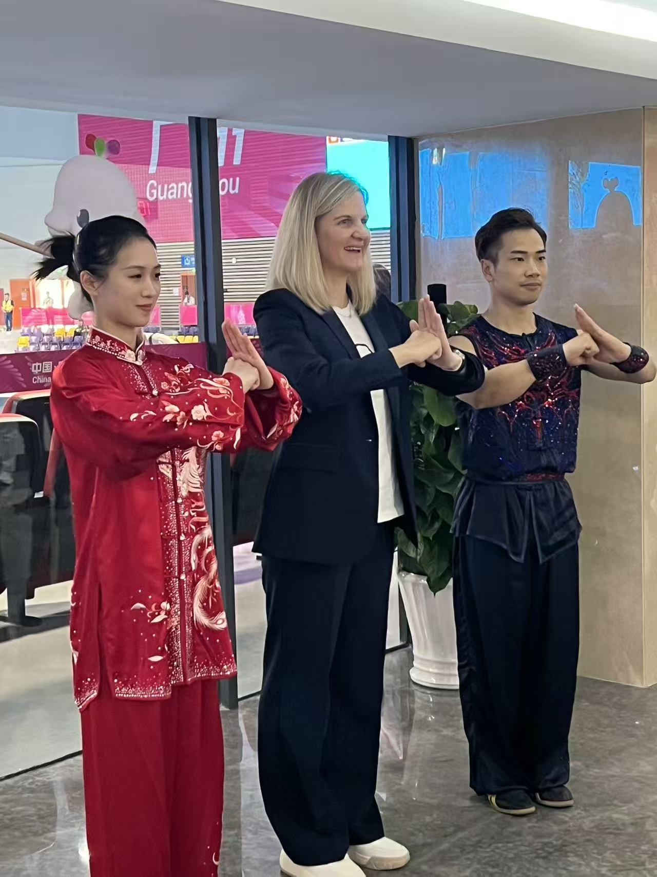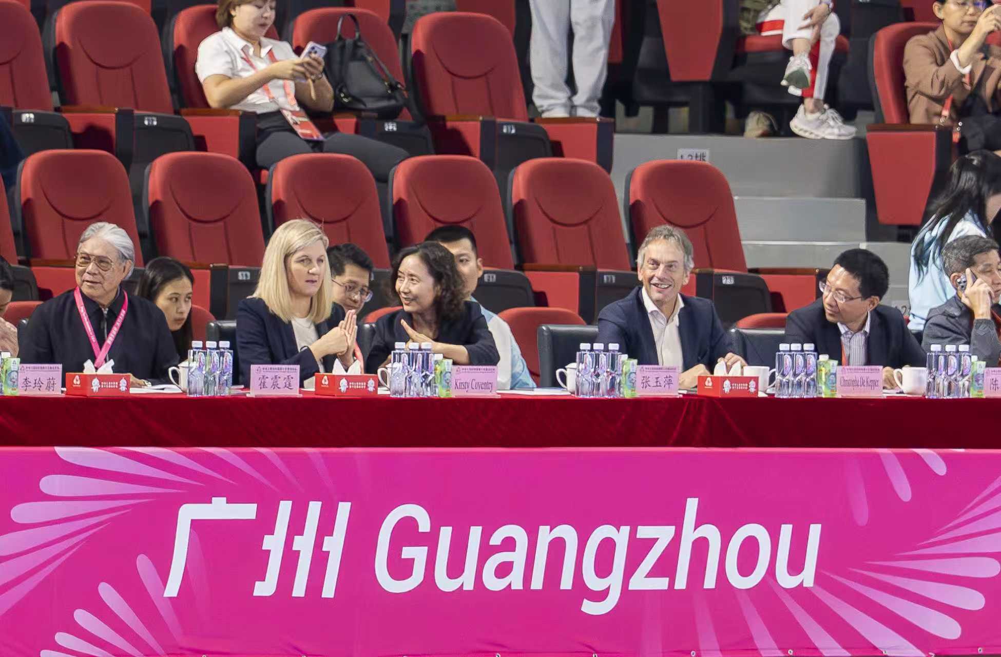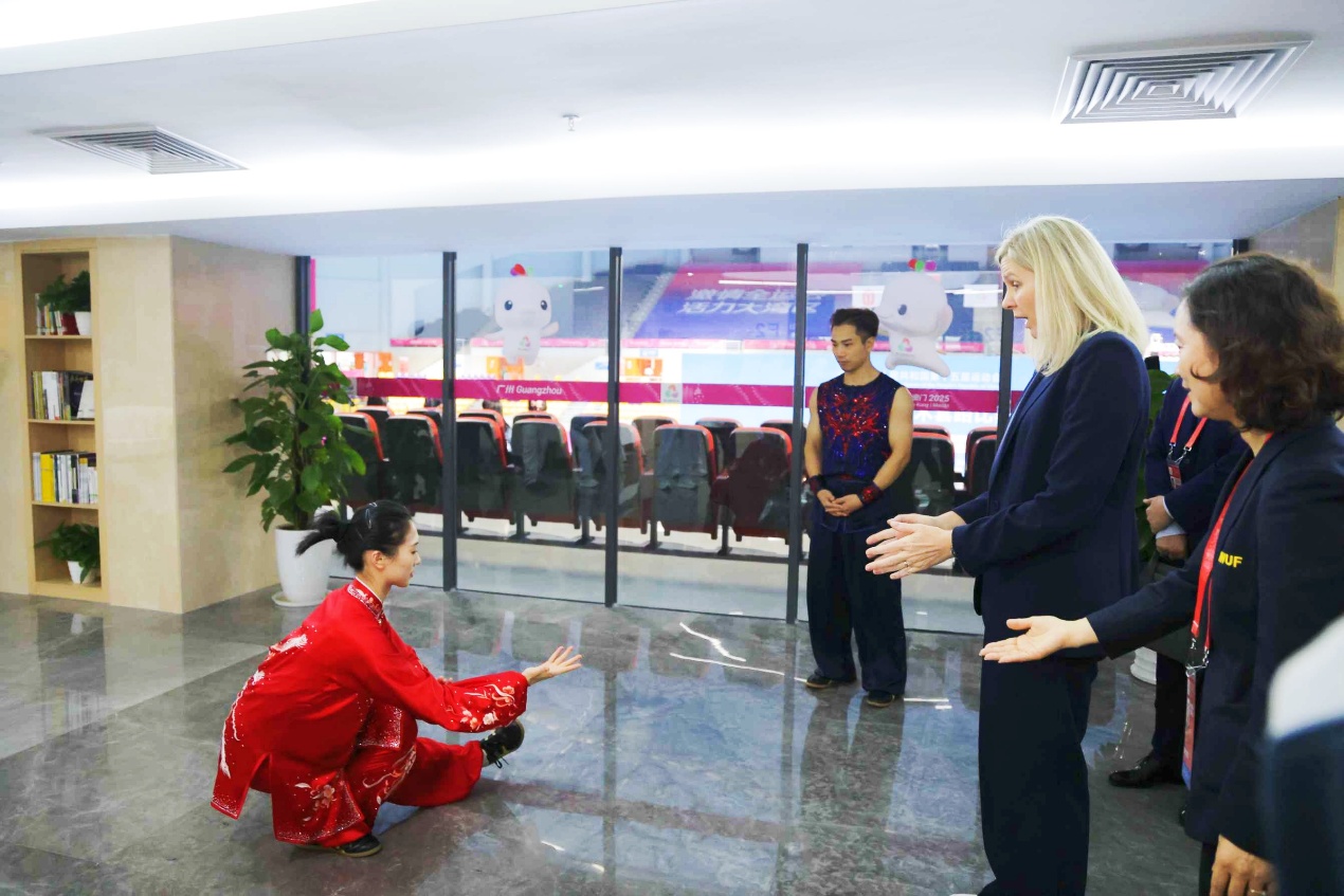 赛事收官当日,国际奥委会主席考文垂、国际奥委会终身名誉主席巴赫一行的到来成为全场比赛最大亮点。上午,全运会武术套路竞赛委员会执行主任、国家体育总局武术运动管理中心主任、国际武联秘书长张玉萍会见了考文垂、国际奥委会执委李玲蔚等一行,并陪同观看男子剑术和女子刀术比赛。赛后,考文垂与童心、李剑鸣两位冠军亲切互动,童心现场展示太极拳经典招式,身姿稳健、气韵流转;李剑鸣则以刚劲有力的南拳表演震撼全场,考文垂连声赞叹,还风趣地提醒周围人“站开一点”,随后兴致勃勃地学起武术抱拳礼,与运动员合影留念。她盛赞本次比赛“充满力与美”,并表示武术将在2026年达喀尔青奥会正式登上奥运舞台,“我们将中国武术带到非洲大陆,这是一件令人兴奋的事情”。