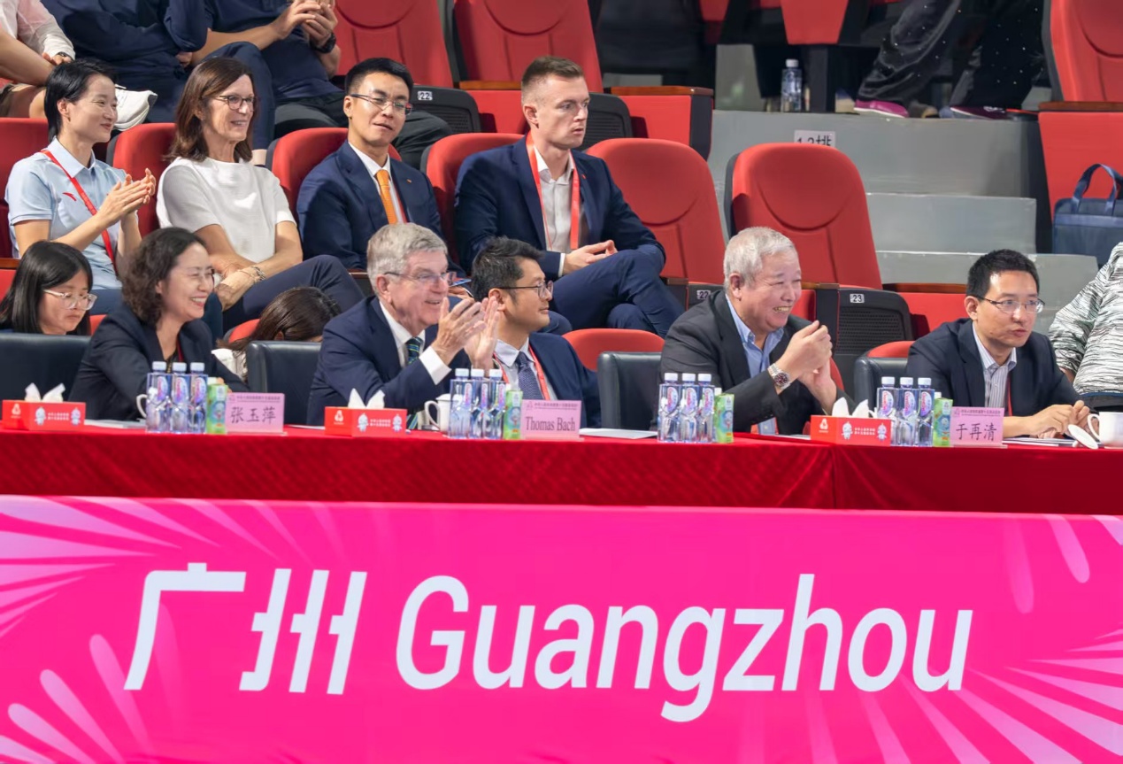 下午,国际奥委会终身名誉主席巴赫、国际武术联合会名誉主席、国际奥委会委员于再清在张玉萍陪同下观看了男子三人徒手对练和女子二人器械对练比赛,赛后与姚洋、陈惠颖、杨亚霖、刘德文等四位冠军互动,现场观摩了剑术、南棍、太极剑和长拳展示。这是巴赫第三次来华参加全运会,他高度评价各参赛队伍的表现,称中国在奥林匹克运动中扮演着越来越重要的角色,为体育促进世界团结提供了极大助力,并亲自为团体冠军运动员颁奖。