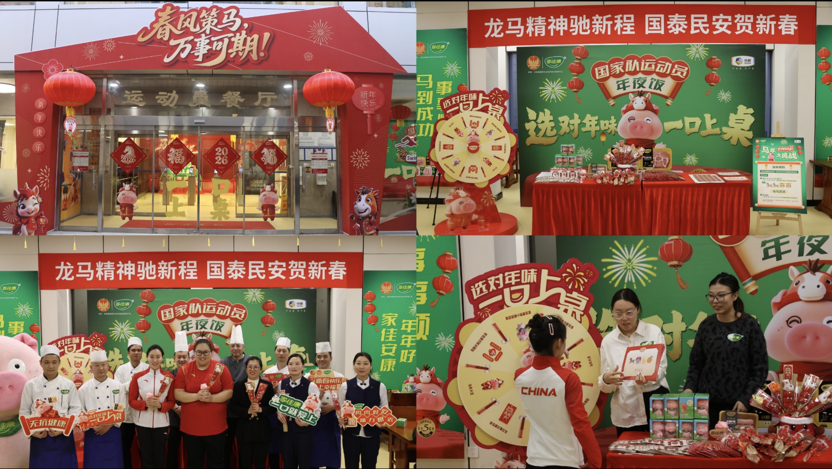 在热闹欢腾的年夜饭现场,中粮家佳康精心策划了诸如成语猜谜、幸运大转盘等形式多样的互动游戏,并且准备了家佳康马年红包、捏捏猪、糖葫芦玩偶以及特色冰箱贴等各类奖品。国家队的运动员与教练员们在品尝美味年菜之际,亦积极投身于游戏活动当中,整个运动员餐厅内弥漫着浓厚的年味与欢快的气氛。