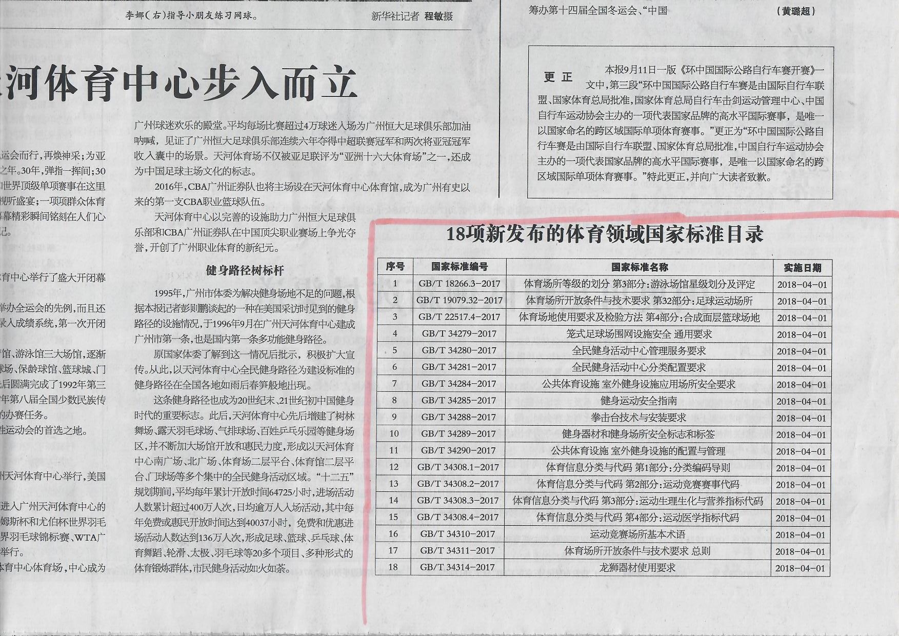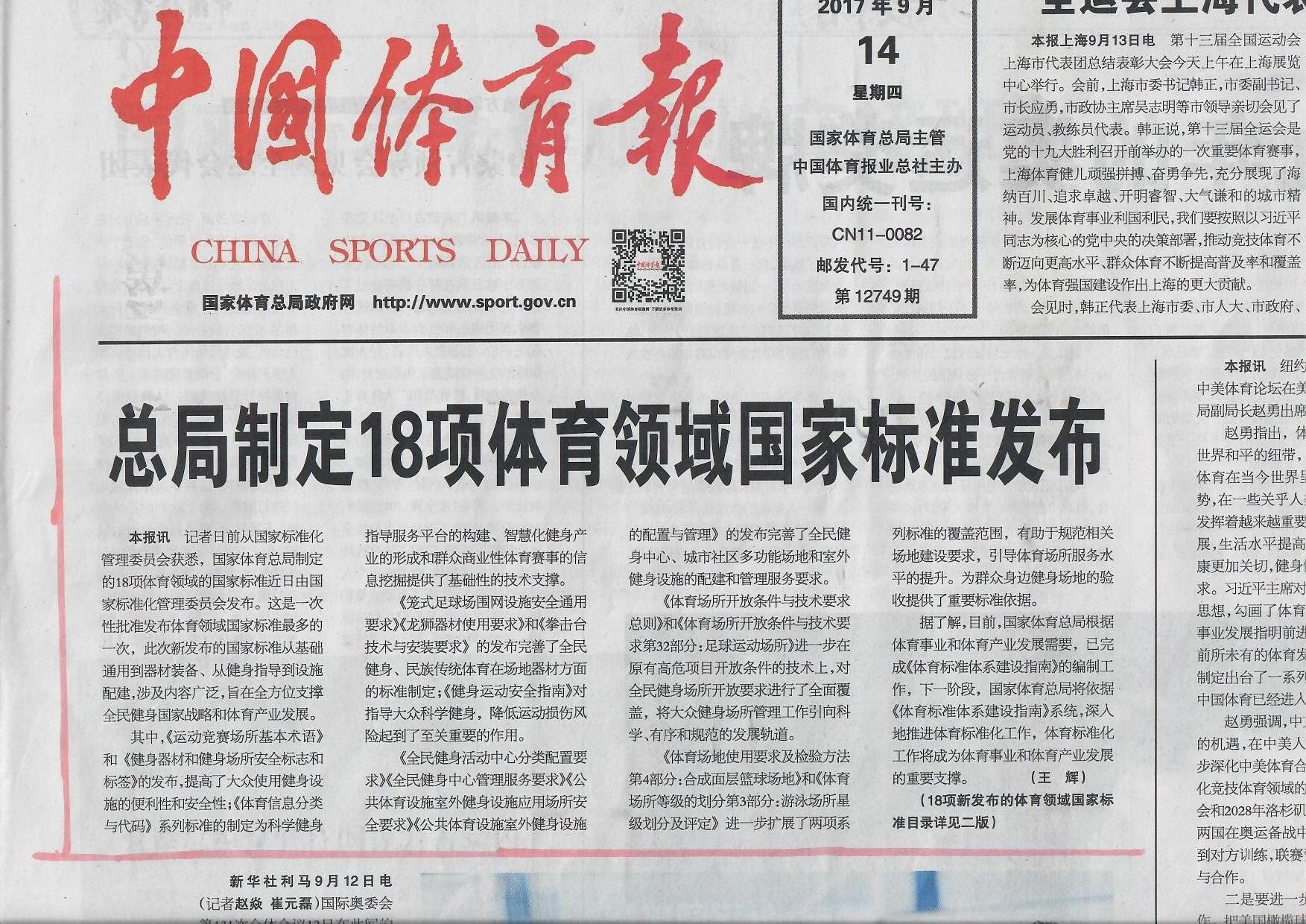 自2016年起,装备中心在国家体育总局经济司领导下,在体育系统各相关单位的共同努力下,完成了一批国家标准的制定工作,近日,在国家标准2017年第22号公告中,集中发布了18项体育领域国家标准,装备中心在中国体育报9月14日头版头条位置刊发了的相关报道。此次发布的国家标准是一次性批准发布体育领域国家标准数量最多的一次。涉及内容广泛,全方位支撑了全民健身国家战略和体育产业发展。