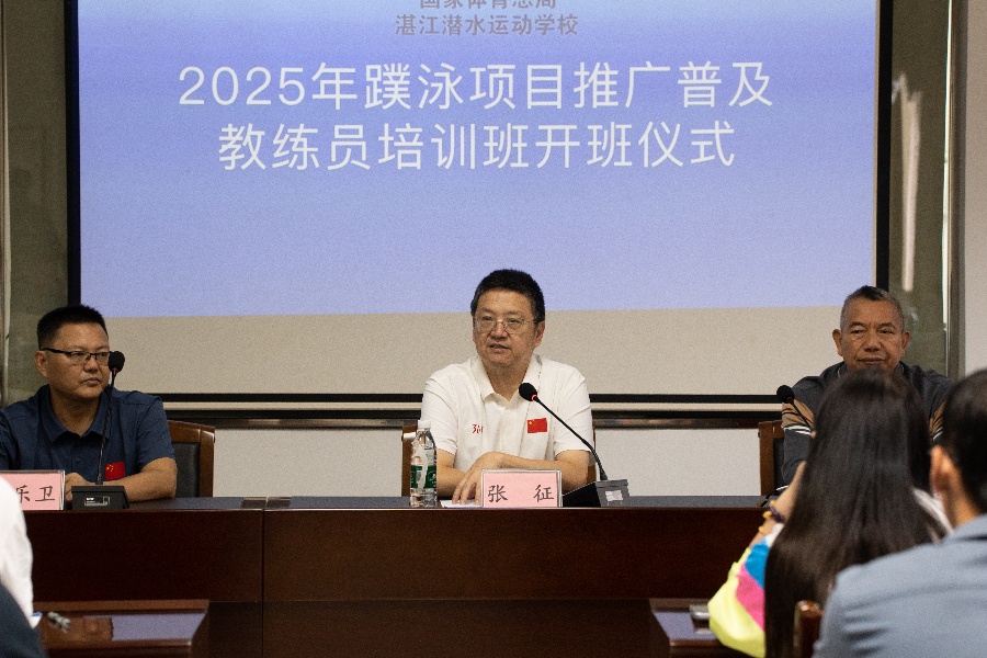 湛江潜校校长、党委书记张征出席开班仪式并讲话。他指出,湛江潜校作为中国潜水运动的发源地和国家水上运动人才培养基地,将继续发挥专业与资源优势,积极扩大蹼泳项目参与人群规模,着力提升教练员培养质量,推动蹼泳运动在全国范围内的普及与发展。希望各位学员珍惜学习机会,加强交流、互相借鉴,在今后的教学与训练工作中充分发挥示范带动作用,为蹼泳项目推广贡献力量。